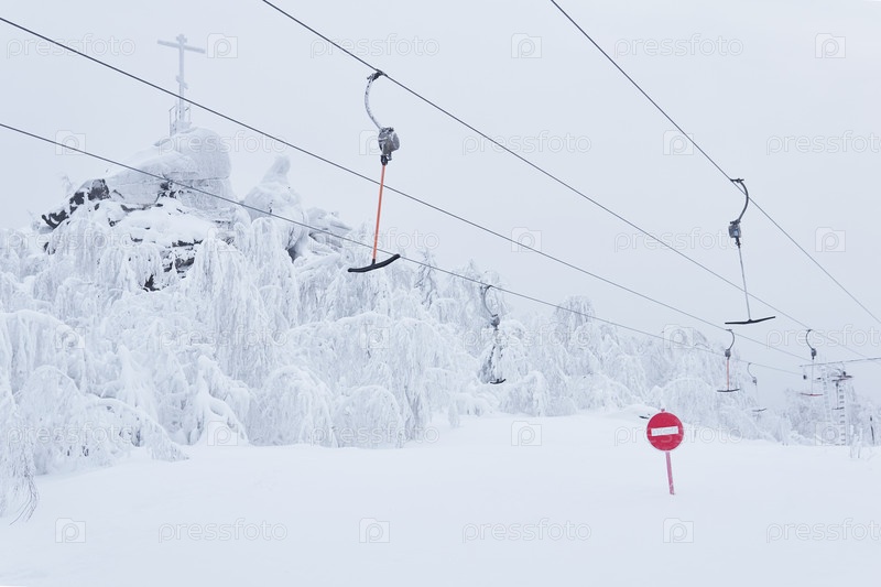 Запрещающий дорожный знак Вход запрещен на фоне пустой лыжной поверхности подъемников на заснеженном горнолыжном склоне