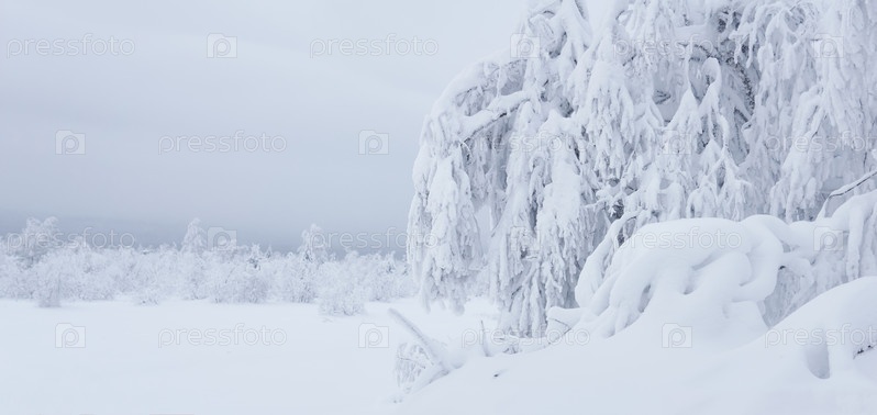 Деревья в диком зимнем пейзаже, покрытые снегом и инеем после снегопада