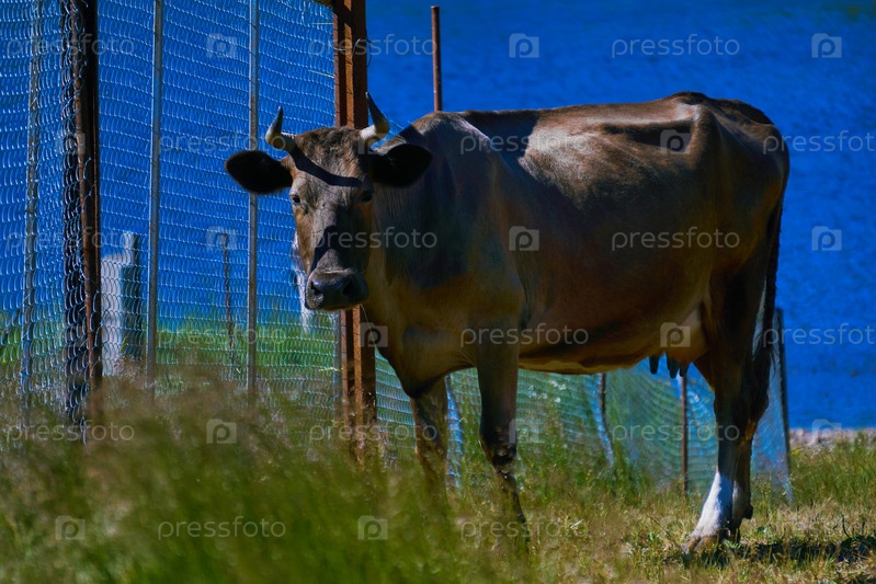 Корова грустно стоит возле забора пастбища