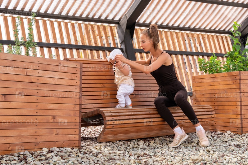 Молодая мама со своей маленькой дочкой играют на скамейке в парке