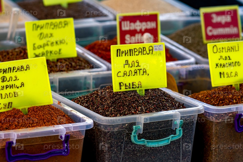Красочные специи в контейнерах на местном базаре в Кемере, Турция