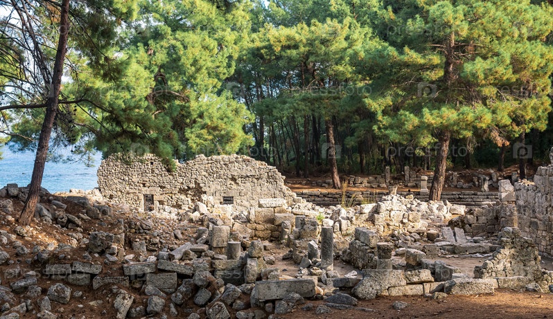 Вид на заросшие руины древнего города Фаселис с остатками зданий и центральной улицей