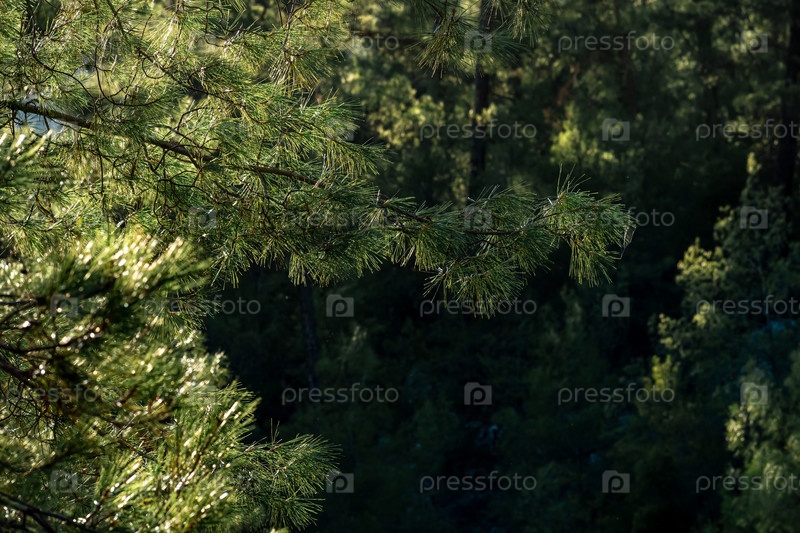 Сосновая ветка крупным планом на фоне размытого горного леса в солнечный день