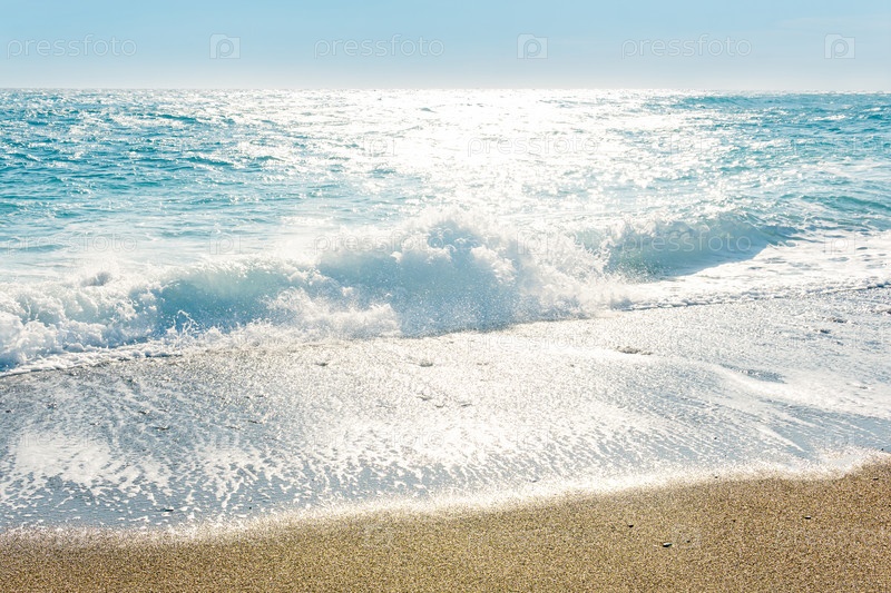 Морской прибой на пляже в ветреный солнечный день