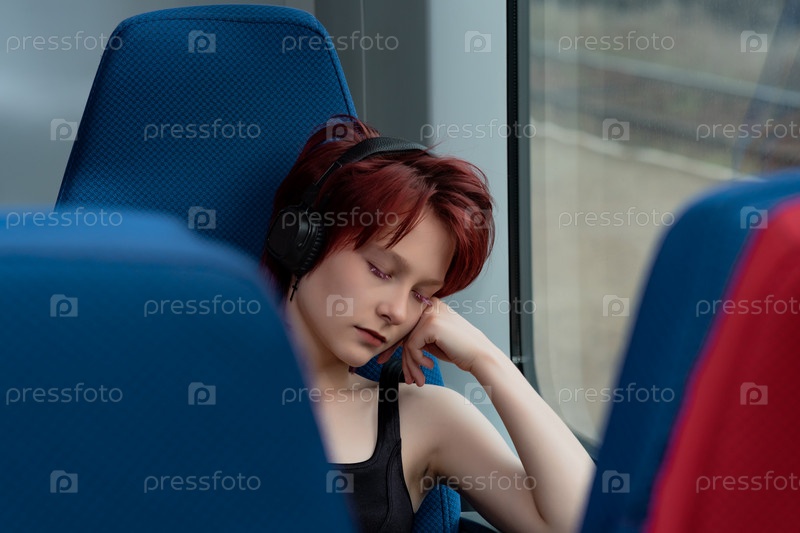 Молодая женщина задремала, сидя в кресле в вагоне пригородного поезда