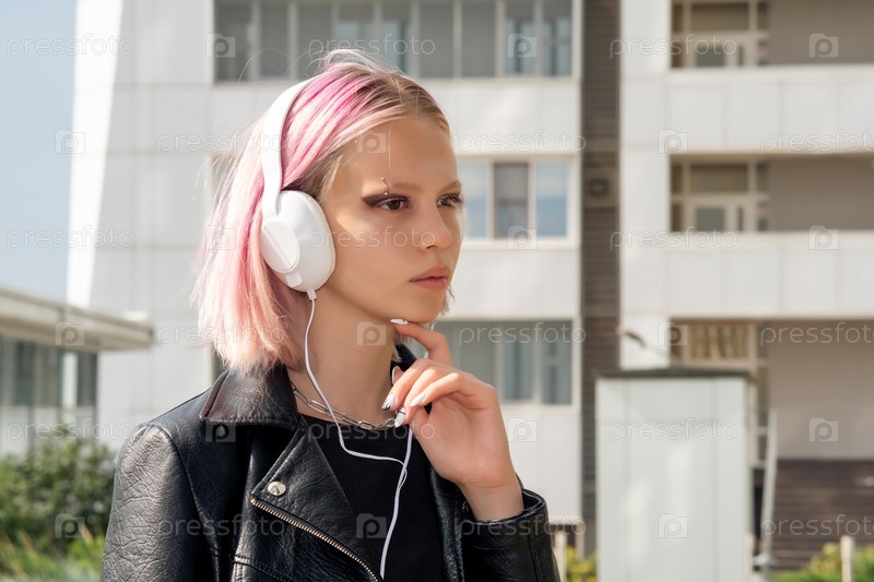 Девочка-подросток слушает музыку в наушниках на открытом воздухе на фоне города