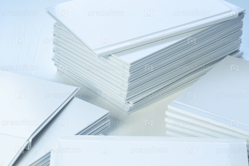 Стопки свежеотпечатанных фотокниг на столе крупным планом, чистая белая обложка