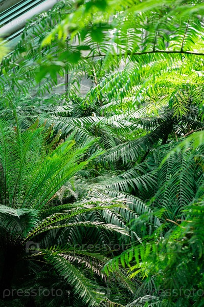 Различные тропические папоротники в большой теплице