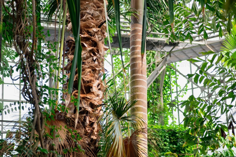 Пальмы и другие тропические деревья в большой теплице