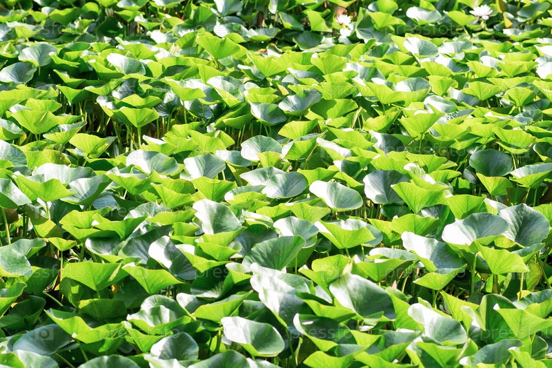 Пейзаж: листья лотоса полностью покрывают поверхность воды