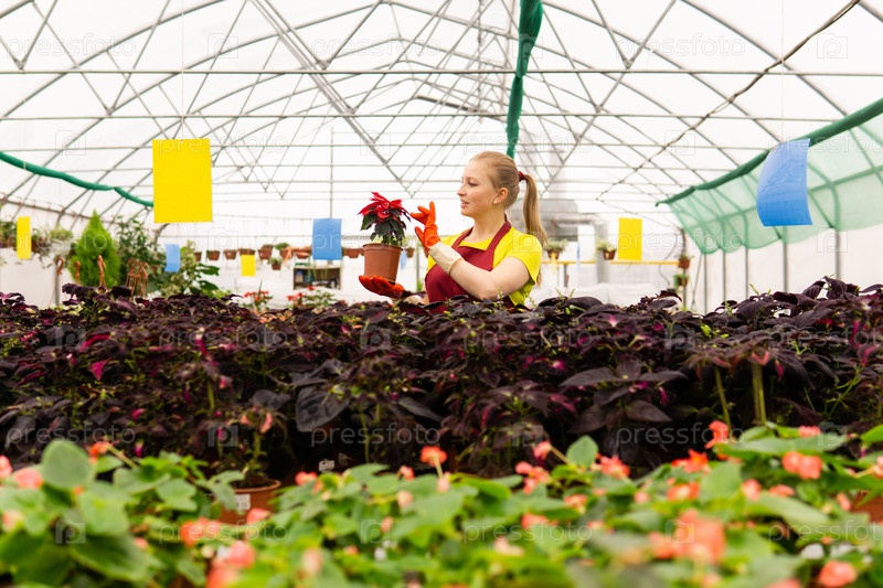 Женщина-садовник в теплице с комнатными растениями