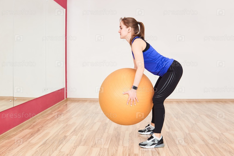 Молодая женщина тренируется, делая приседания с фитболом в тренажерном зале