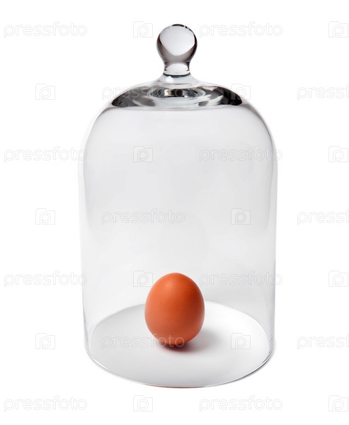 Яйцо чувствует себя защищенным под стеклянной крышкой, изолированным на белом фоне