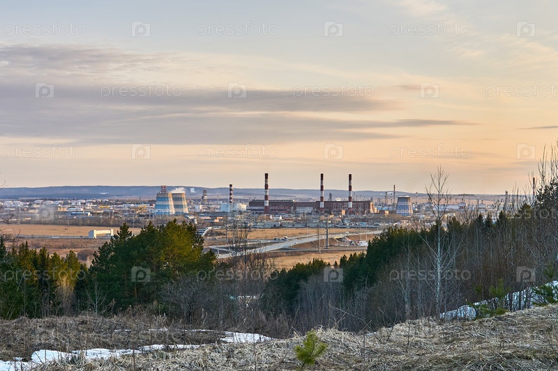 Промышленный пейзаж ранней весной с электростанцией в долине