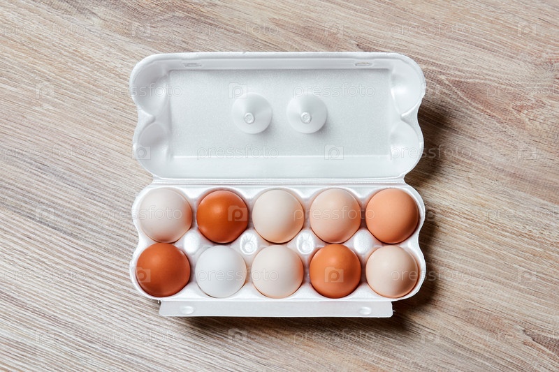 Яйца разного цвета от белого до коричневого вместе в ящике на поверхности деревянного стола