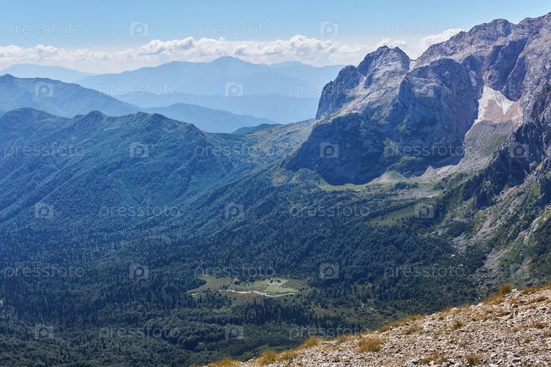 Вид на долину горы Фишт с одноименным туристическим приютом в Кавказском заповеднике