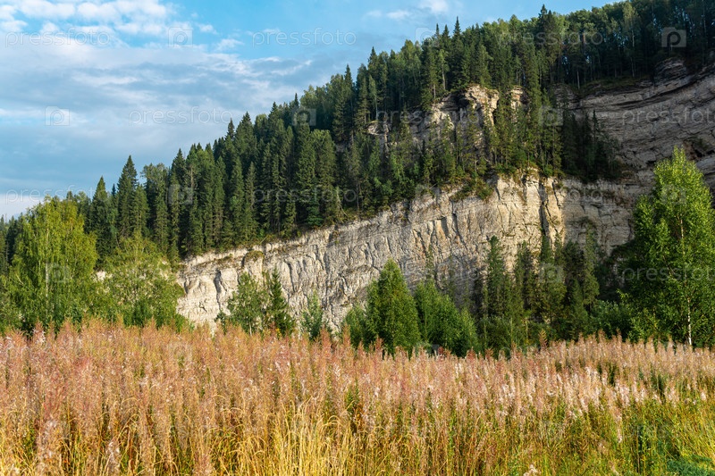 Осенний пейзаж с лесистыми известняковыми скалами на заднем плане на Среднем Урале, Россия
