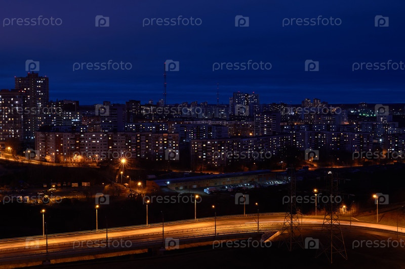 Ночной городской пейзаж с освещенной дорогой на переднем плане и жилыми районами на заднем плане