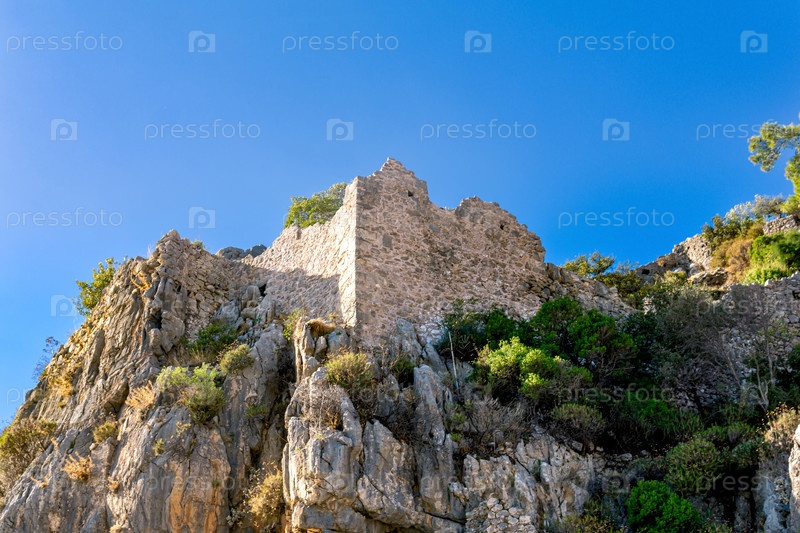 Руины крепостных стен на склонах скалистых гор недалеко от античного города Олимпос, Турция