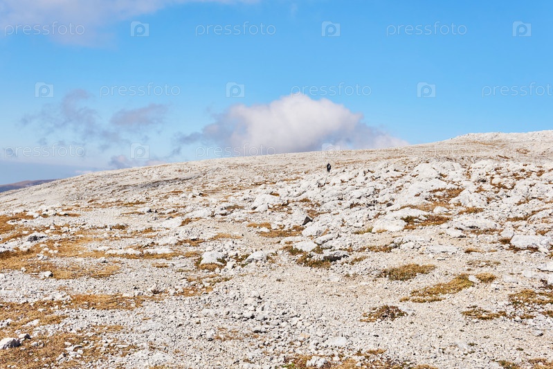 Высокогорное плато, покрытое белыми камнями, и вдалеке пара путешественников