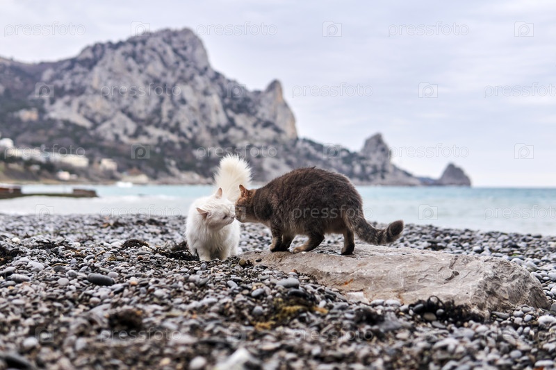 Две кошки знакомятся друг с другом на галечном морском пляже