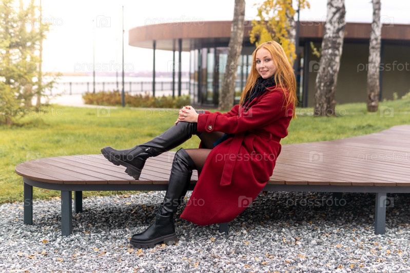 Улыбающаяся девушка сидит на скамейке в осеннем парке