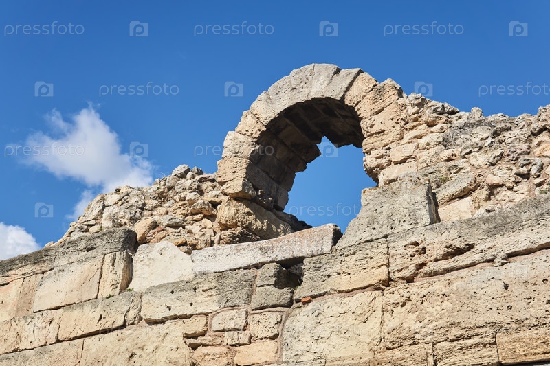Фрагмент разрушенной античной крепостной стены с аркой на фоне неба