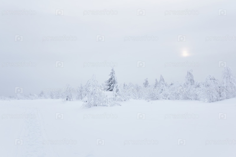 Северный пейзаж - замерзшая лесотундра под глубоким снегом в морозной дымке