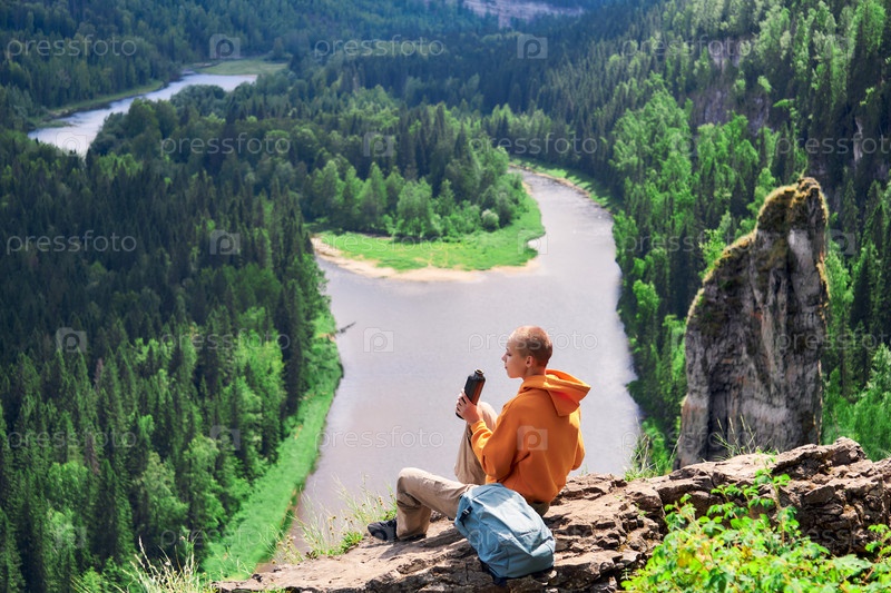 Девочка-подросток-путешественница отдыхает на краю скалы над рекой на фоне природного ландшафта