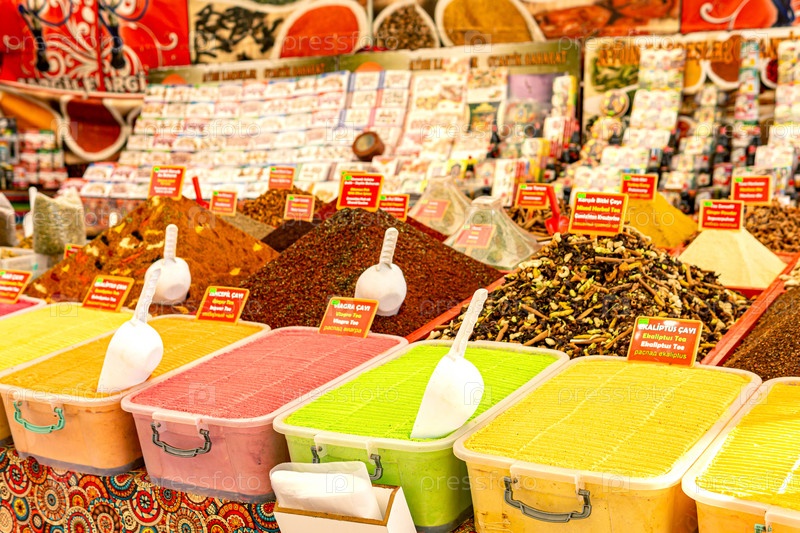 Красочные специи и фруктовые чаи на местном базаре в Кемере, Турция