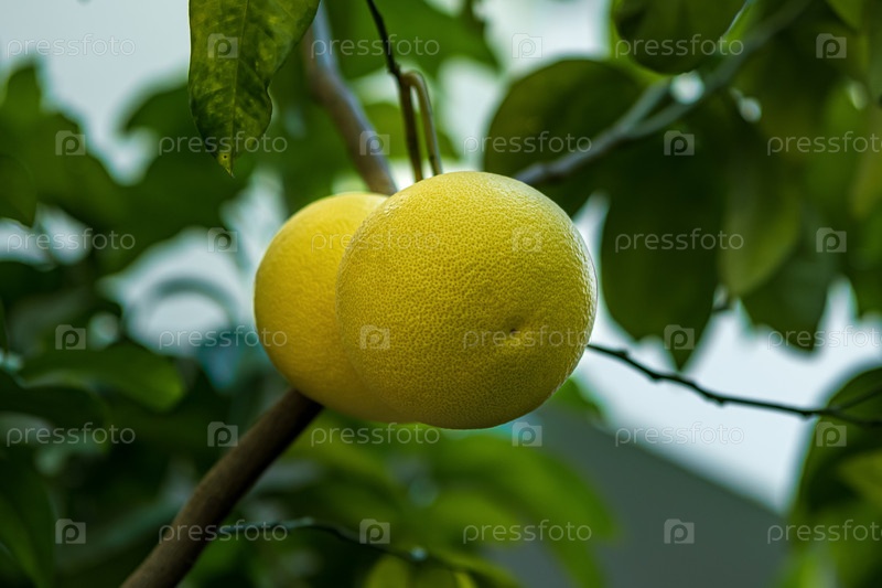 Созревающие плоды помело на ветке в саду крупным планом