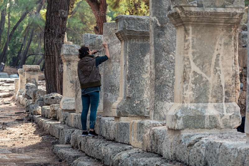 Археолог восстанавливает древнюю надпись на колонне в Фазелисе, Турция