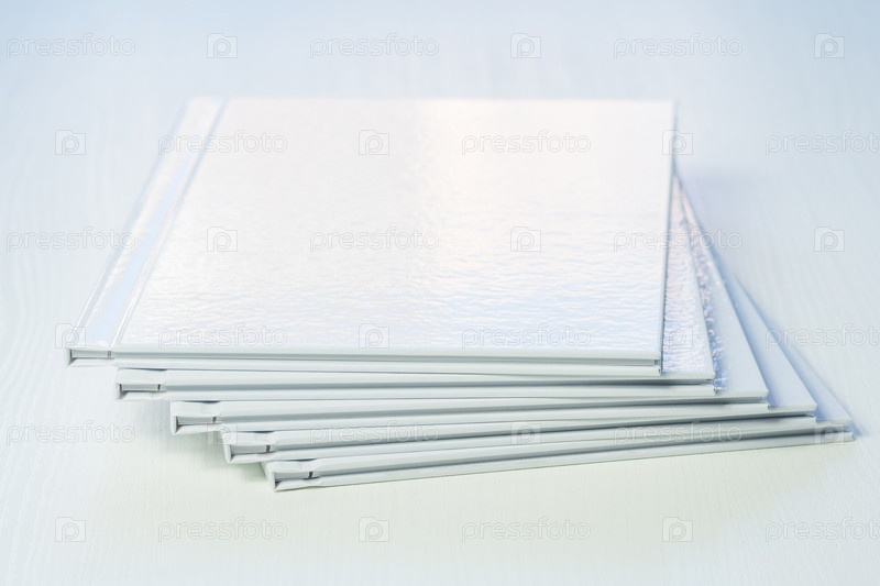Стопка печатной продукции, фотокниги крупным планом, пустые обложки