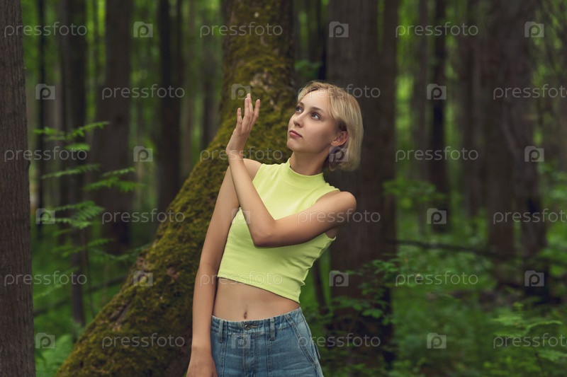 Молодая женщина в лесу отпугивает комара