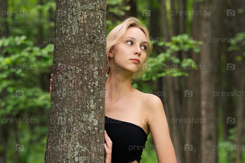 Красивая девушка выглядывает из-за дерева в лесу