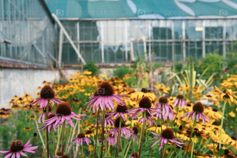 Фиолетовые цветы эхинацеи в саду на фоне стены теплицы