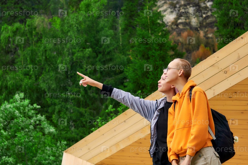 Двое подростков смотрят вдаль на фоне паркового пейзажа