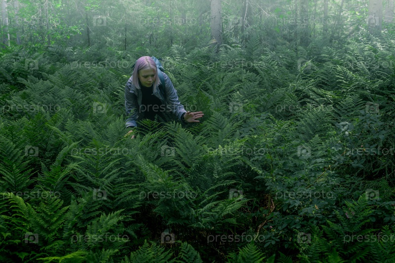 Девушка в туманном лесу среди папоротников увлечена природой