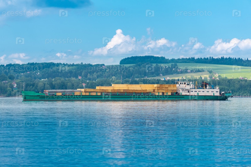 Грузовой корабль с лесом следует по широкой реке в солнечный день