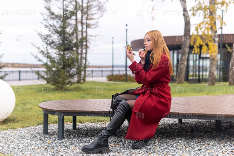 Рыжеволосая молодая женщина поправляет макияж, сидя на скамейке в осеннем парке