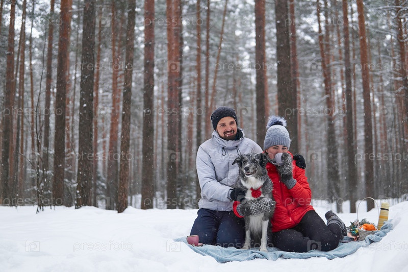 Молодая пара с собакой устраивают пикник в заснеженном лесу