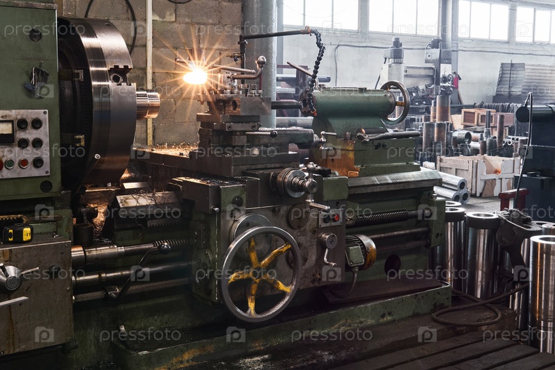 Фрагмент заводского цеха с токарным станком на переднем плане