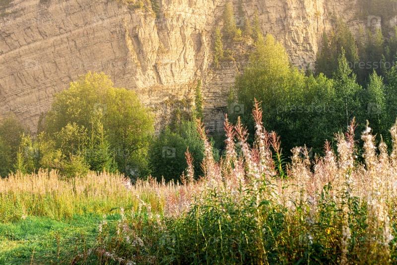 Пейзаж с освещенной солнцем скалой на заднем плане и размытой травой на переднем плане