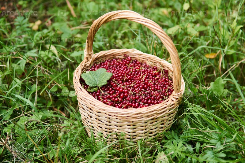 Плетеная корзина с ягодами красной смородины стоит в траве