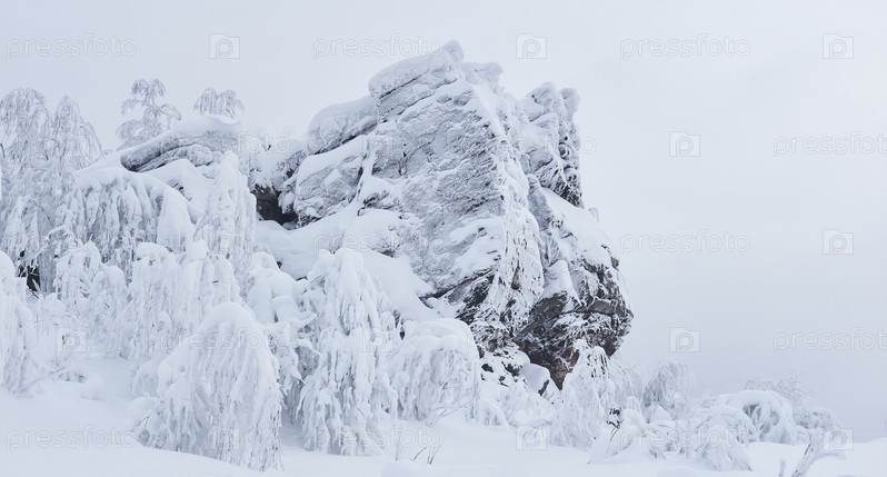 Замерзшая скала и деревья с покрытыми инеем ветвями на горном перевале после метели