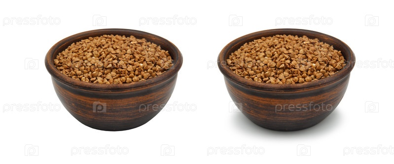 Гречневое зерно в глиняной миске на белом фоне, изолированное и с тенью