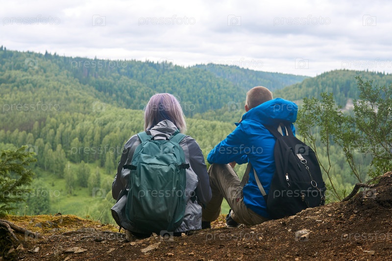 Двое подростков с рюкзаками сидят на краю обрыва, глядя вдаль на холмы