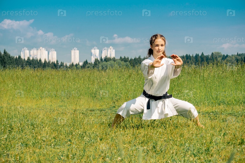 Девушка-подросток занимается карате кихон ката на открытом воздухе в позиции киба-дачи