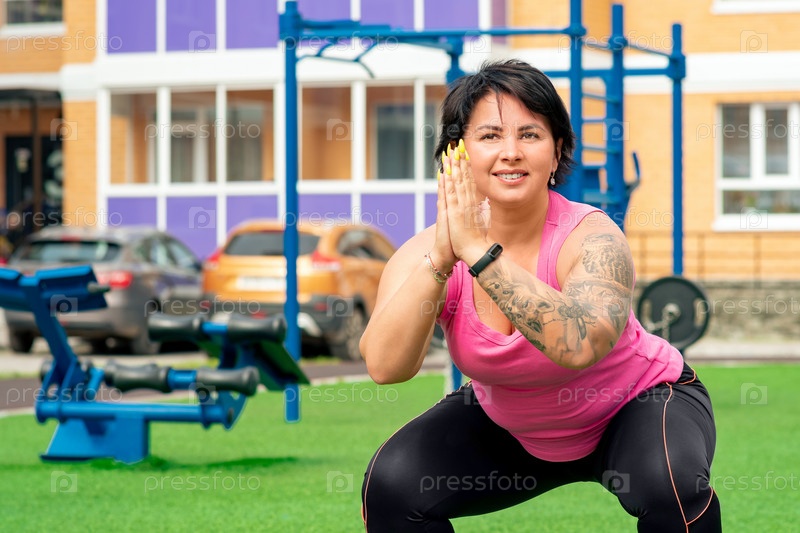 Сильная пухлая женщина делает приседания на спортивной площадке во дворе городского дома