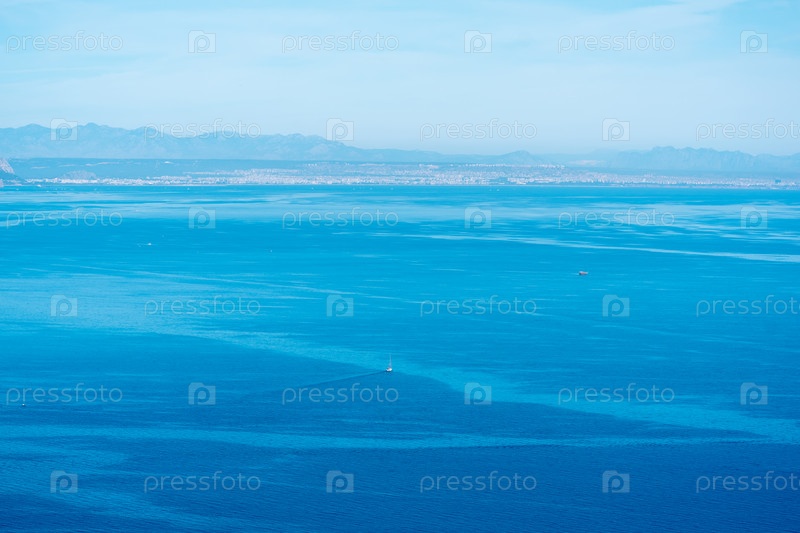 Вид с воздуха на голубой морской пейзаж, панорама побережья Анталии
